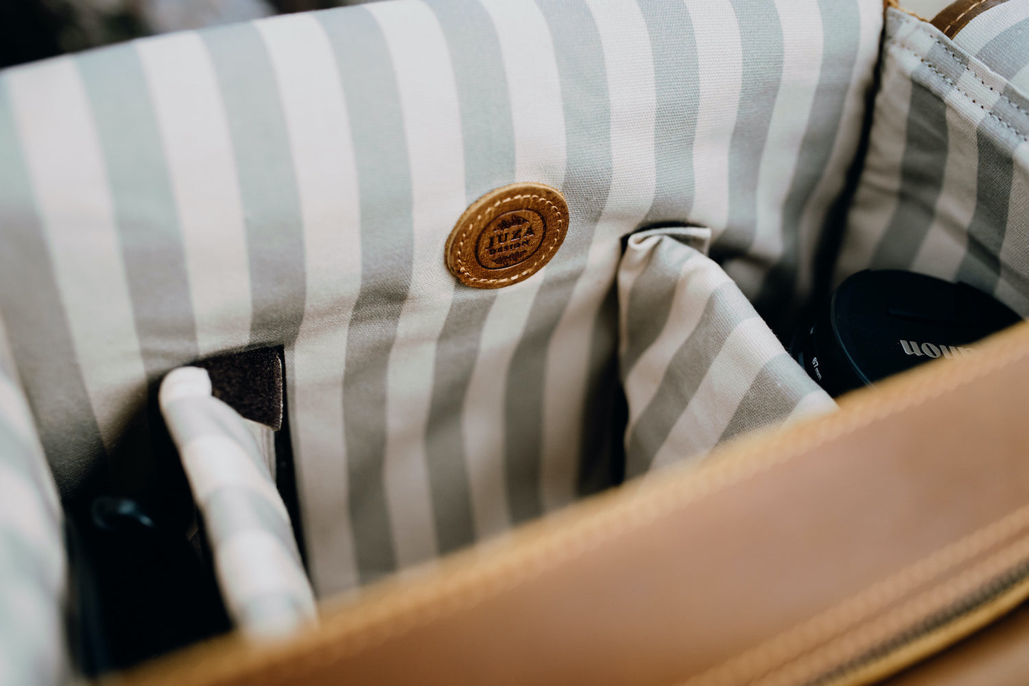 Real leather camera bag with adjustable shoulder strap in color light brown with beige and khaki stripes on the inside. The measures of the bag are 29 cm (width) * 14 cm (depth) * 21.5cm (height).